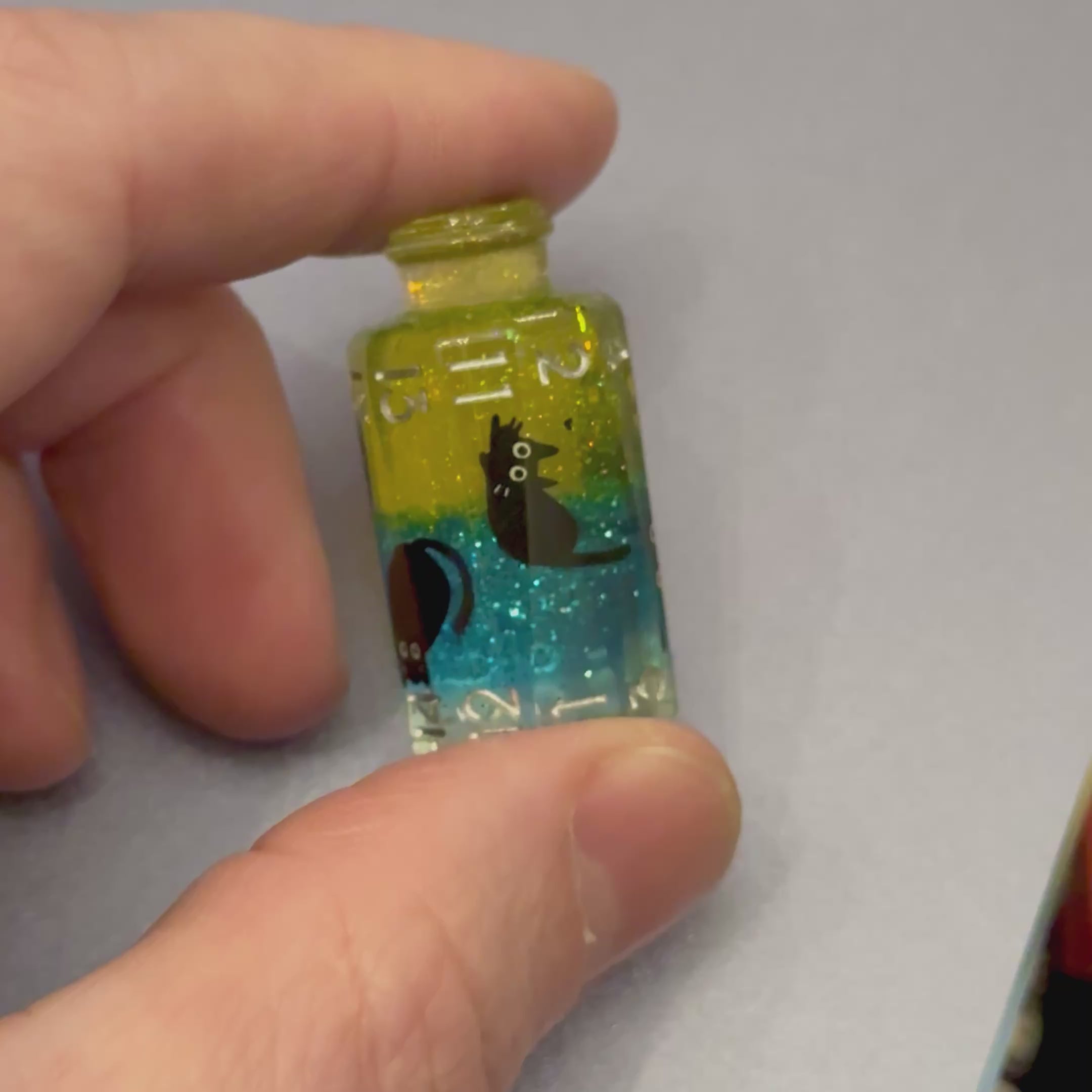 - Design : Dés en forme de flacon de potion avec des chats familiers flottants