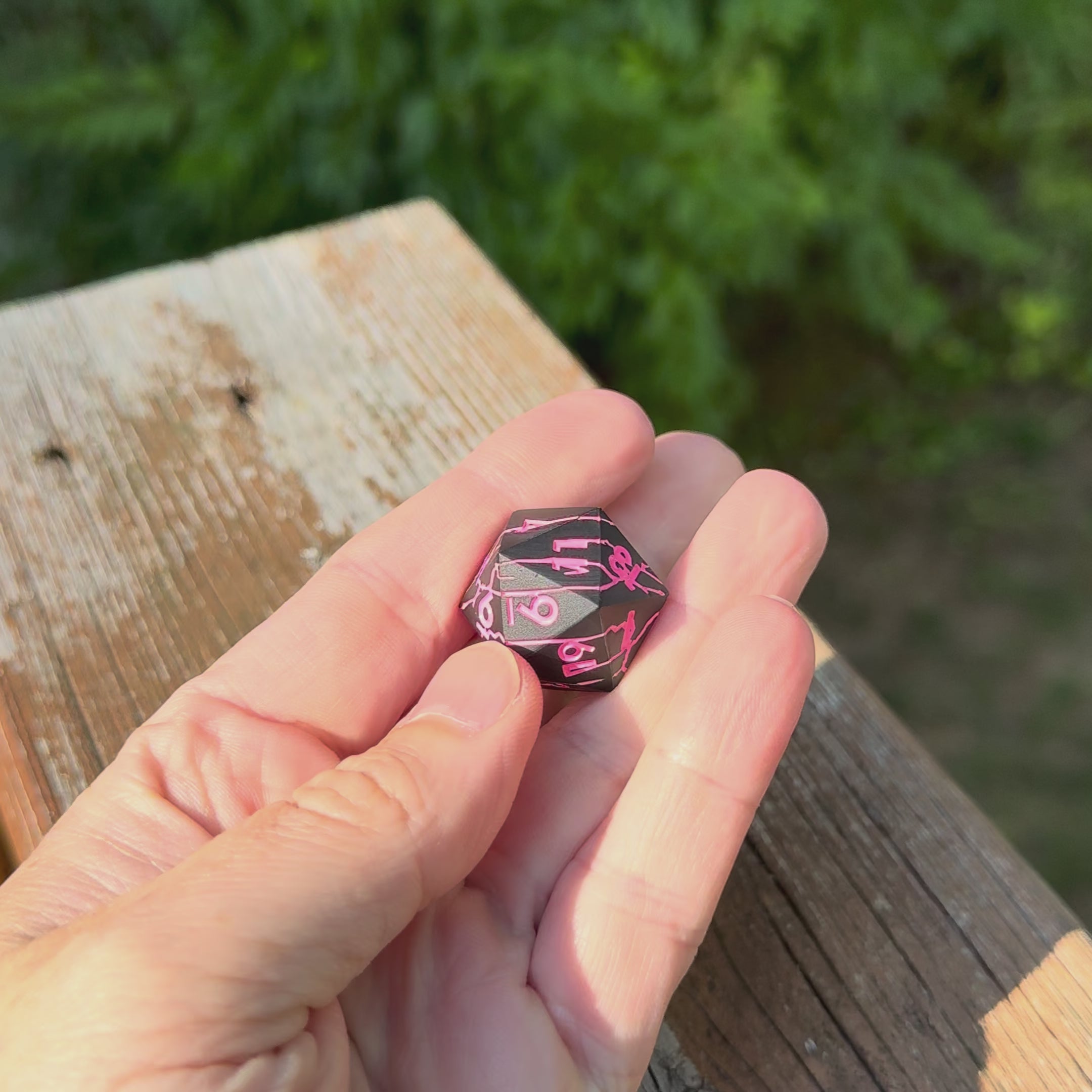 Forgé dans les ténèbres et traversé de veines d'énergie rose ardente, le jeu de dés en métal Veinshatter semble tout droit sorti du cœur d'une forge arcanique en ruine. Chaque face noire mate est fracturée de fissures magenta luisantes, comme si les dés eux-mêmes peinaient à contenir la magie brute et chaotique qu'ils contiennent.