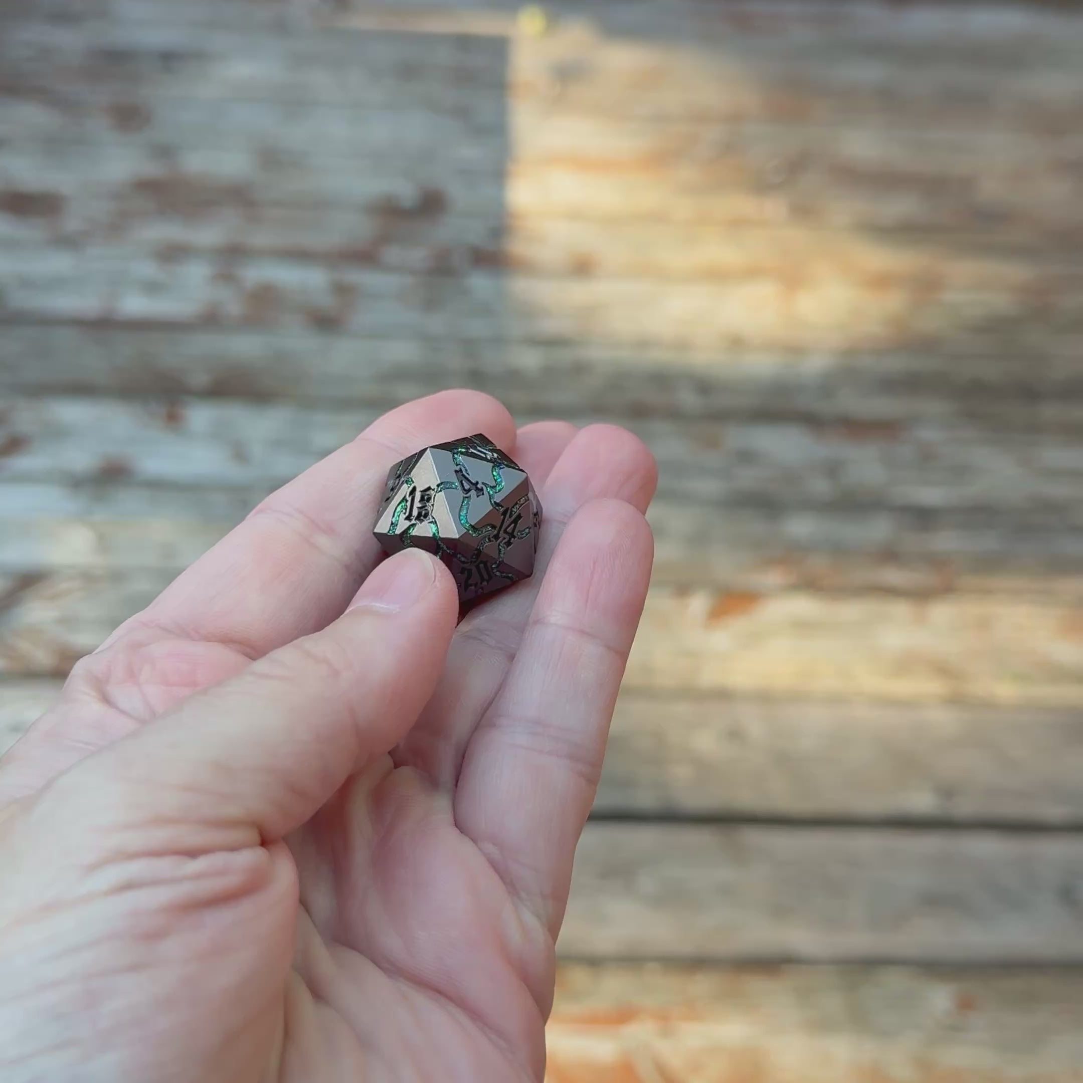 Plongez dans l'ombre avec le jeu de dés en métal d'obsidienne brisée, une combinaison saisissante de bronze poli et de fractures vertes brillantes, semblant provenir des profondeurs d'une grotte de cristal sombre. Chaque pièce est lourde et puissante, parfaite pour rendre chaque lancer spectaculaire.