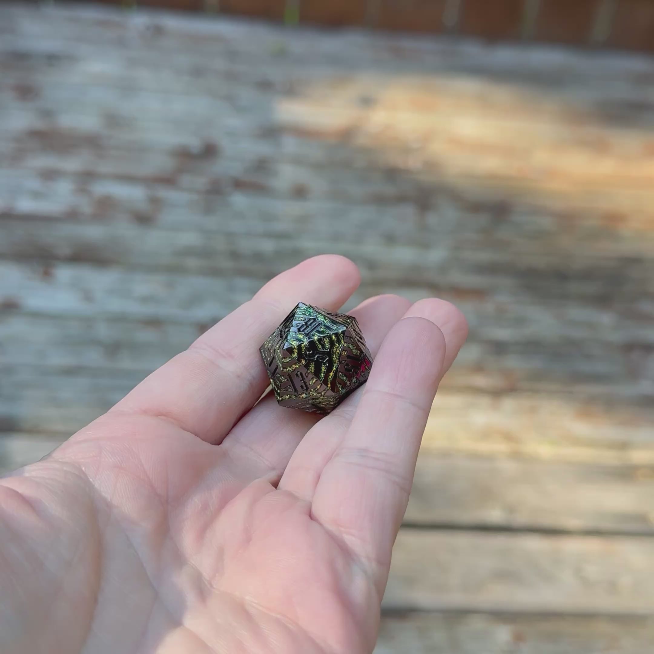 Frappant tel un serpent au clair de lune, les dés Crocs venimeux scintillent d'un éclat vert et doré. Chaque chiffre et chaque bande scintillent comme du venin à travers l'acier, incitant les héros les plus audacieux à tenter leur chance.