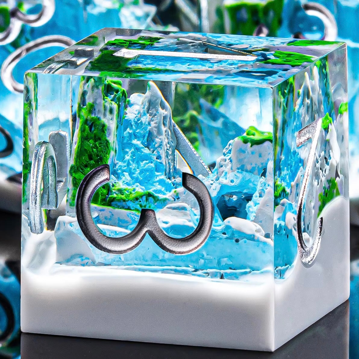 Immerse yourself in the dark, churning depths of the Elemental Cascade with Abyss Falls. Featuring a mesmerizing blend of icy blue and shadowed black with vivid green mossy highlights, these dice capture the essence of a hidden waterfall deep within a forgotten cavern. Finished with silver numbering for crisp readability.