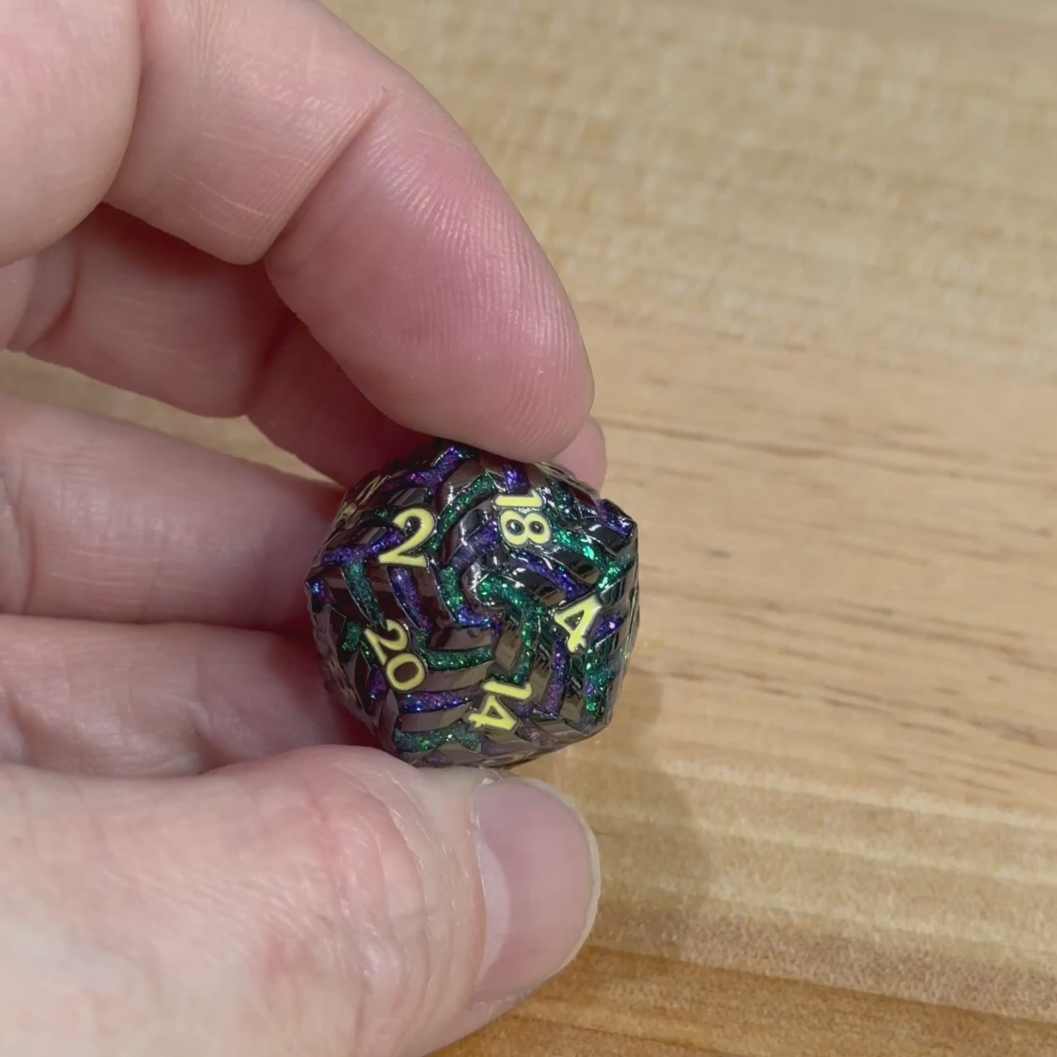 Voidbloom Spiral weaves shadow and color into a living pattern. Blackened metal blooms with streaks of purple and green mica, flowing through each spiraled face like arcane growth breaking free of control. The result is chaotic elegance—wild, beautiful, and dangerous.