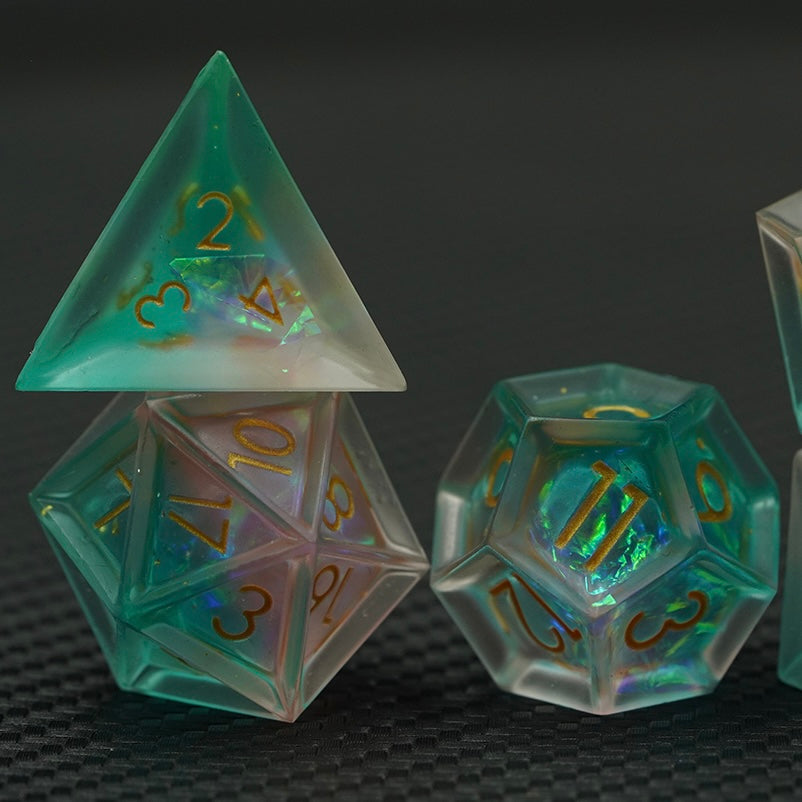This premium line of sharp-edge dice features a proprietary layered resin design that creates breathtaking internal vistas of colour and light. Each die contains a stunning interplay of shimmering layers and opalescent inclusions, captured within a crystal-clear shell that magnifies their depth and brilliance.
