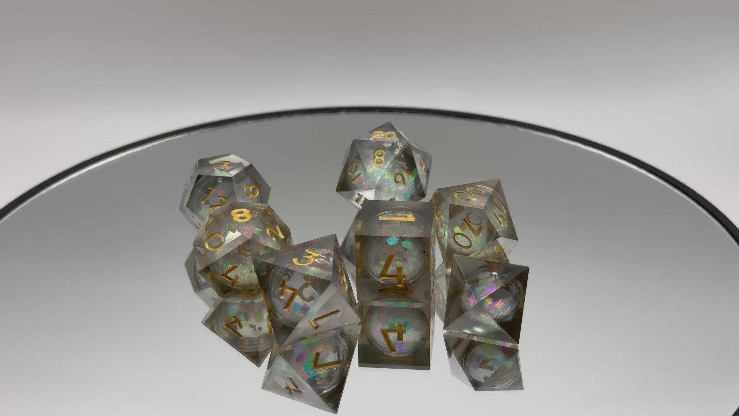 Step into the cosmos with the Void Star Liquid Core Dice Set. Each die features a mesmerizing liquid core swirling with glittering starlight, encased in a smoky, transparent shell that captures the mystique of deep space. The shimmering gold numbers are carefully engraved for clear readability, adding an elegant touch to this galactic design. Perfect for Dungeons & Dragons or any other TTRPG, these dice bring the vastness of the void to your tabletop adventures, making every roll an event to remember.