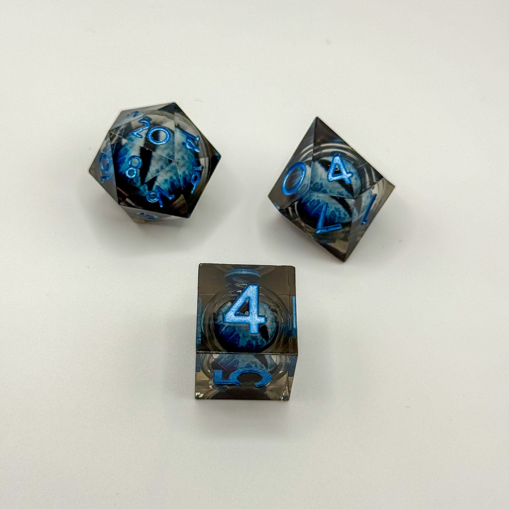 Summon the chill of an ancient glacier and the stare of a frost dragon with the Frostbound Dragon’s Gaze dice set. Encased in clear resin, each die holds a piercing blue draconic eye—an icy sentinel that watches over every roll. The frosty blue numbering echoes the cold breath of winter, perfect for spellcasters, rangers, and frost-wielding heroes alike.