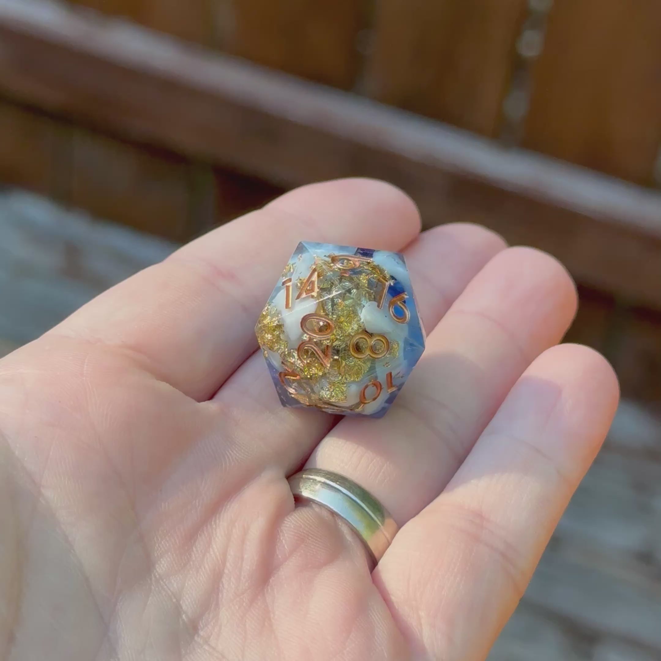 The Stormforged Mist dice swirl with the colors of a brewing tempest. Midnight blue resin mixes with ghostly white clouds, while brilliant flecks of gold foil flash like lightning trapped within. Finished with copper-gold numbering, this set carries both elegance and raw stormborn power to your rolls.